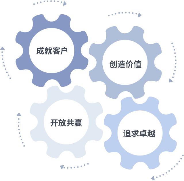 成就客户是一切决策的出发点,,,创造价值是衡量所有工作的标准,,追求卓越是我们做事做人的态度,,,,开放共赢是我们的格局也是最终的结果。。。价值观的齿轮环环相扣,,推动着组织里的每个人不断向前。。。。